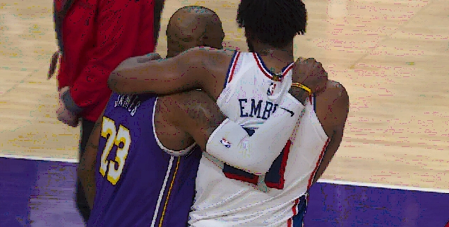 胜负已定之时 詹姆斯拥抱恩比德 两人有说有笑