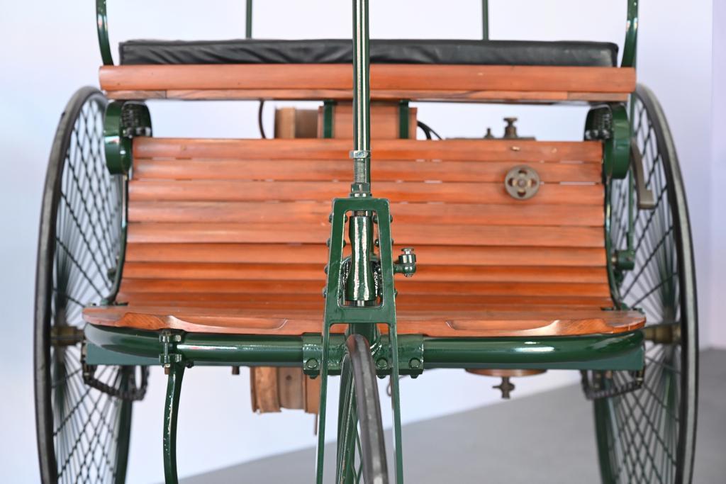 Benz Patent,1886。1886年,卡尔·本茨试制了一台单缸四冲程汽油机,并安装在由钢管和木板构成的三轮车架上。该车采用了钢条幅轮圈和实心橡胶轮胎,通过转动手柄带动齿轮来完成转向,发动机经过传动带机构和链条驱动后轮,速度可达到15公里/小时。